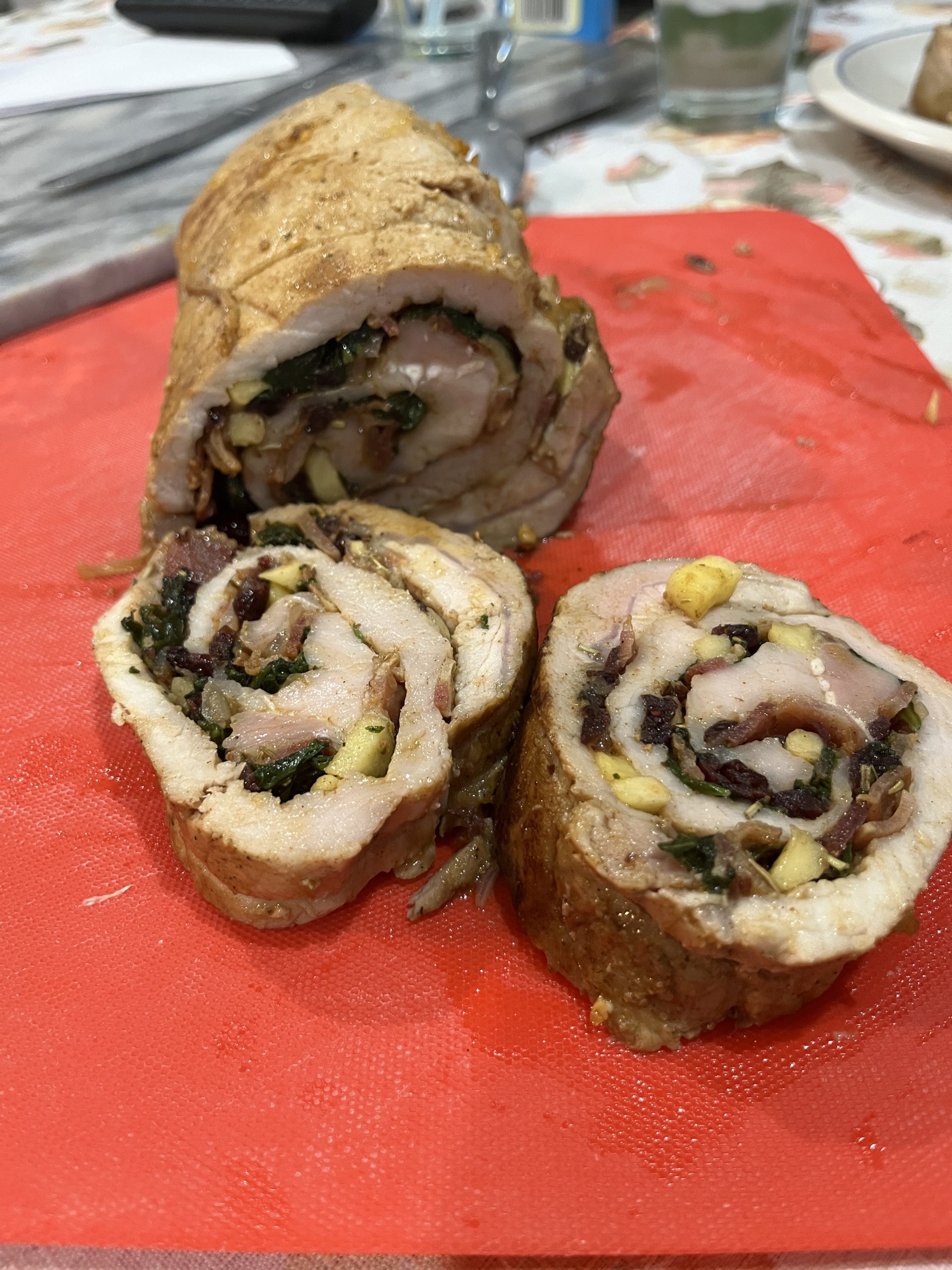 - Spread the prepared filling onto the entire surface of the pork loin, leaving a 1 ½ to 2 inch seam on just one edge ,closest to the top. Pat the filling gently into place.