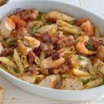 - You can use one large shallow casserole dish or individual serving dishes: In the dish, place the pasta, chicken, bacon, shrimp and cover with sauce; toss to coat.