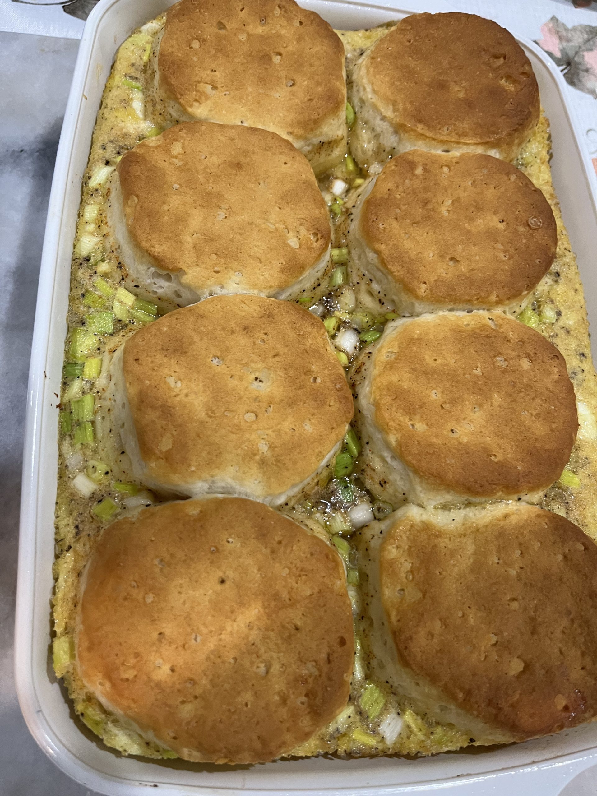 - Pour the egg mixture over the top, then top with the biscuits.