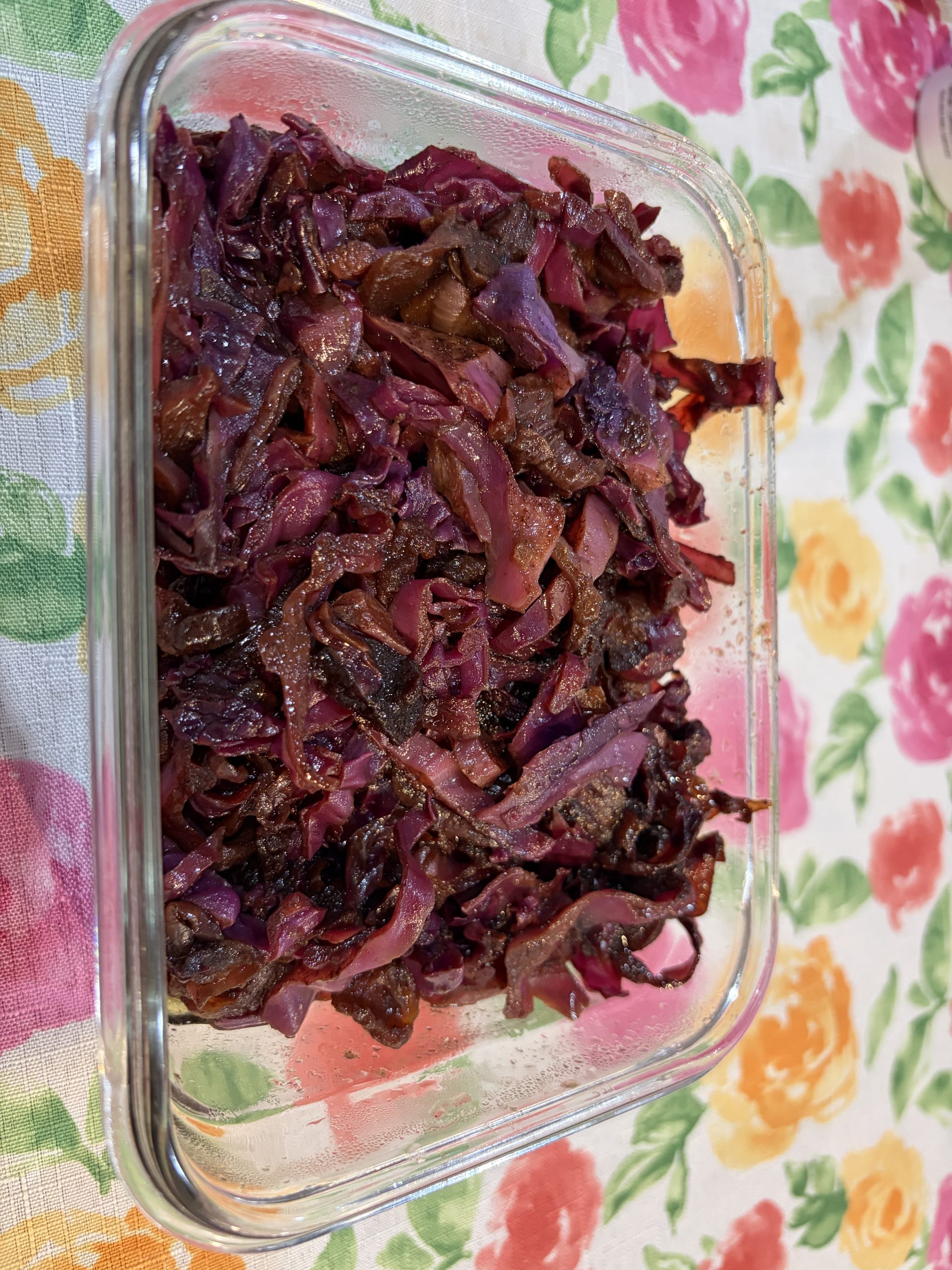 - 1 large red cabbage 2 to 2½ pounds, quartered, cored and cut crosswise in thin strips