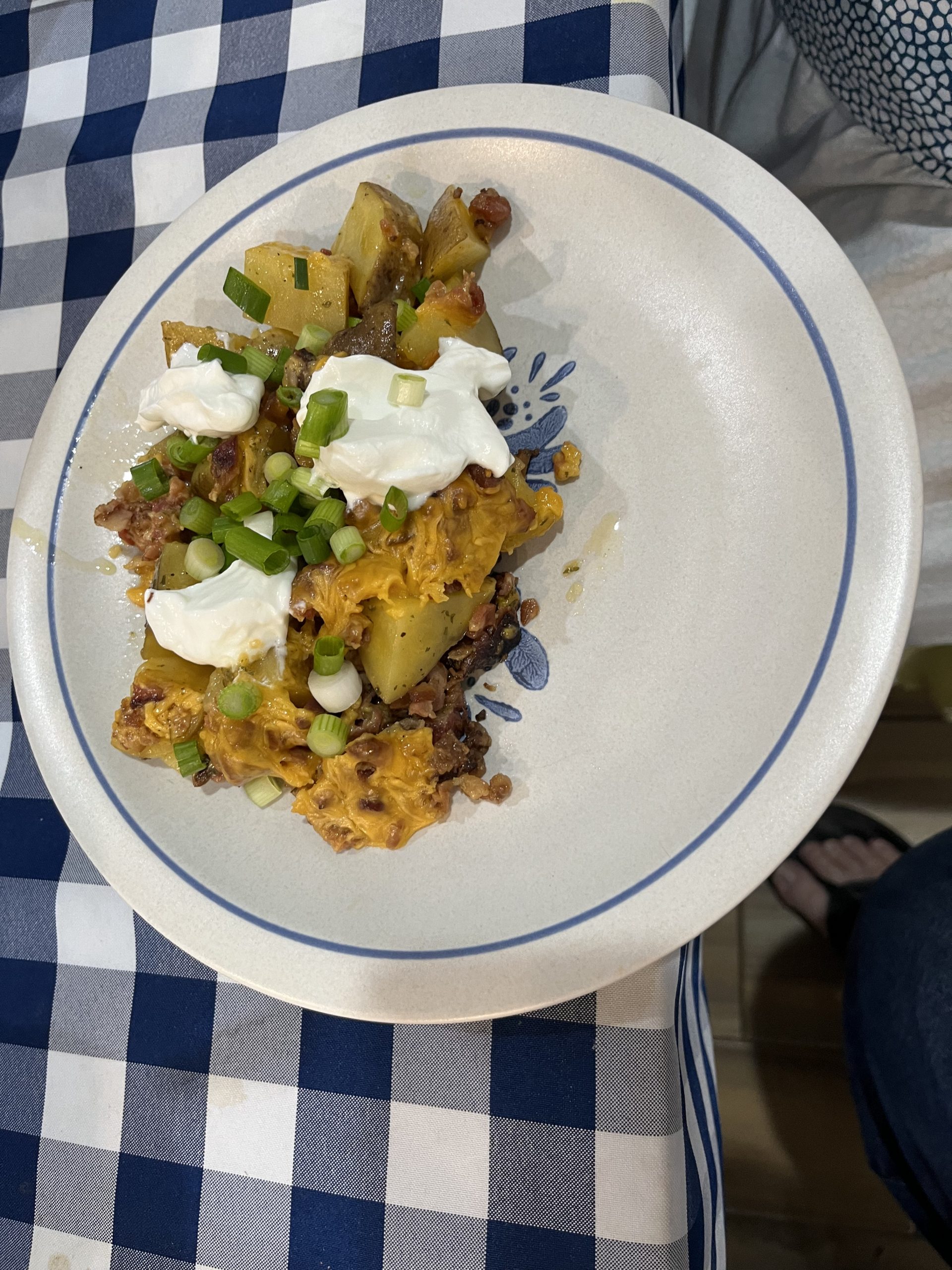 - Sprinkle with remaining cheddar cheese and cover again. Allowing cheese to melt. Serve with sour cream and freshly chopped chives.