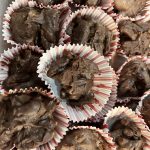 - Use a cookie or ice cream scoop to spoon about 1/4 cup of the melted chocolate pecan mixture over each caramel.