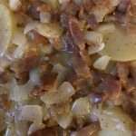 - In a large skillet, cook bacon over medium heat until crisp; using a slotted spoon, remove to paper towels. Drain, reserving 4 tablespoons drippings. In the drippings, saute onion until tender.