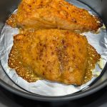 - In a small bowl or larger liquid measuring cup, mix together the brown sugar, Dijon, oil, soy sauce, garlic powder, and ginger (if using). Spoon all over the top of the salmon.