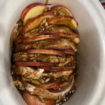 - Place carrots and potatoes in the bottom of slow cooker, then place the apple-filled pork loin on top.