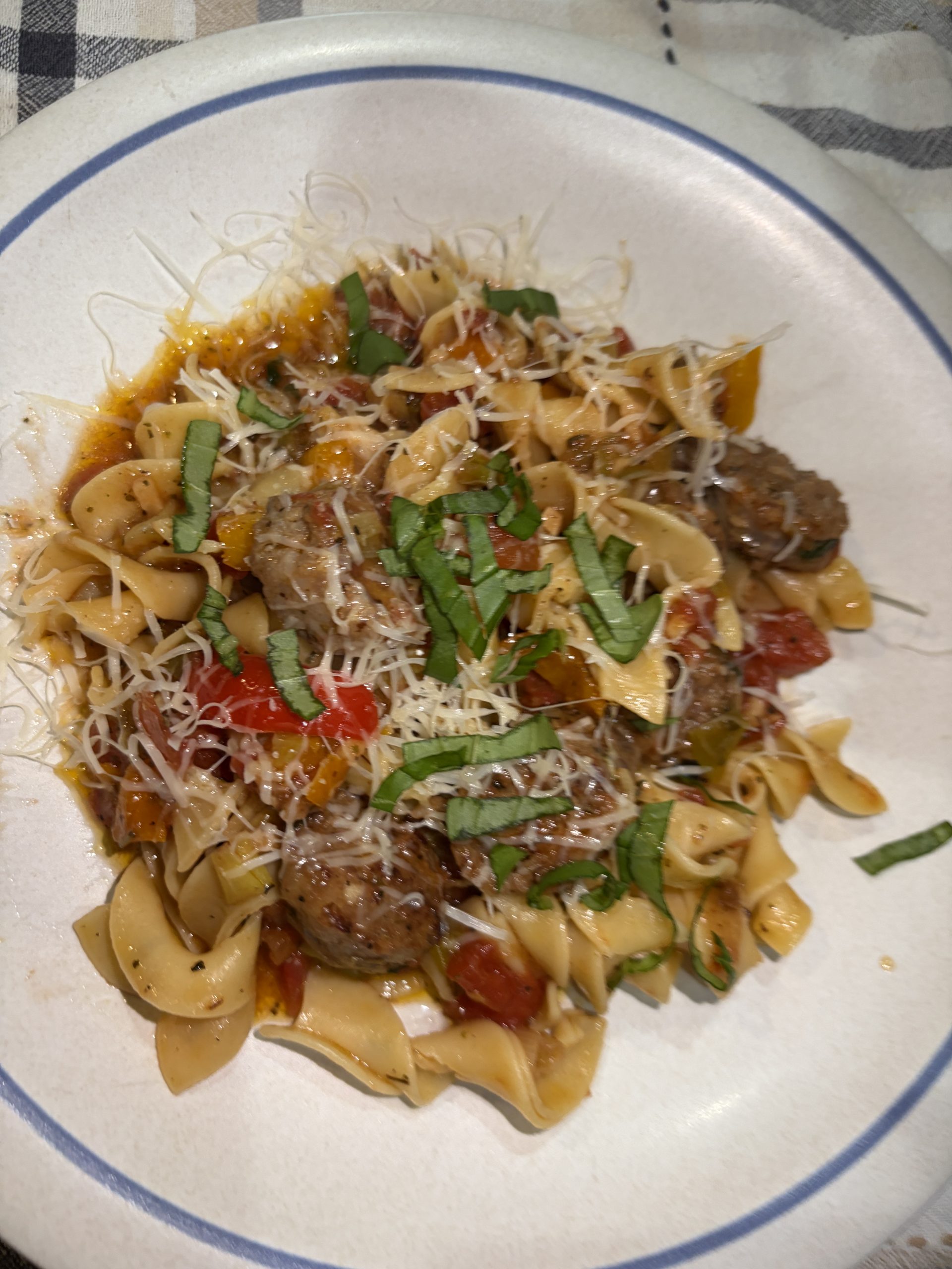 - Return the browned spicy Italian sausage back into the pan and gently fold the mixture to combine. Allow it to gently simmer for about 3-4 minutes to blend the flavors. Then turn the heat off. Stir and keep warm while you prepare the noodles.