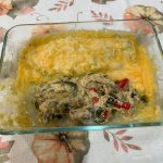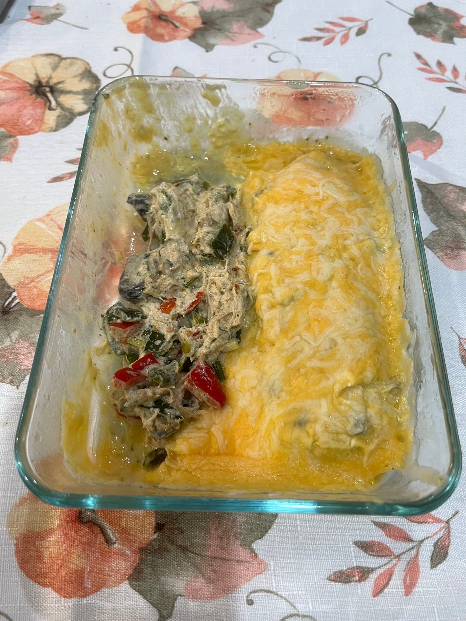 - Cover with the balance of poblano sauce and the cheddar cheese.