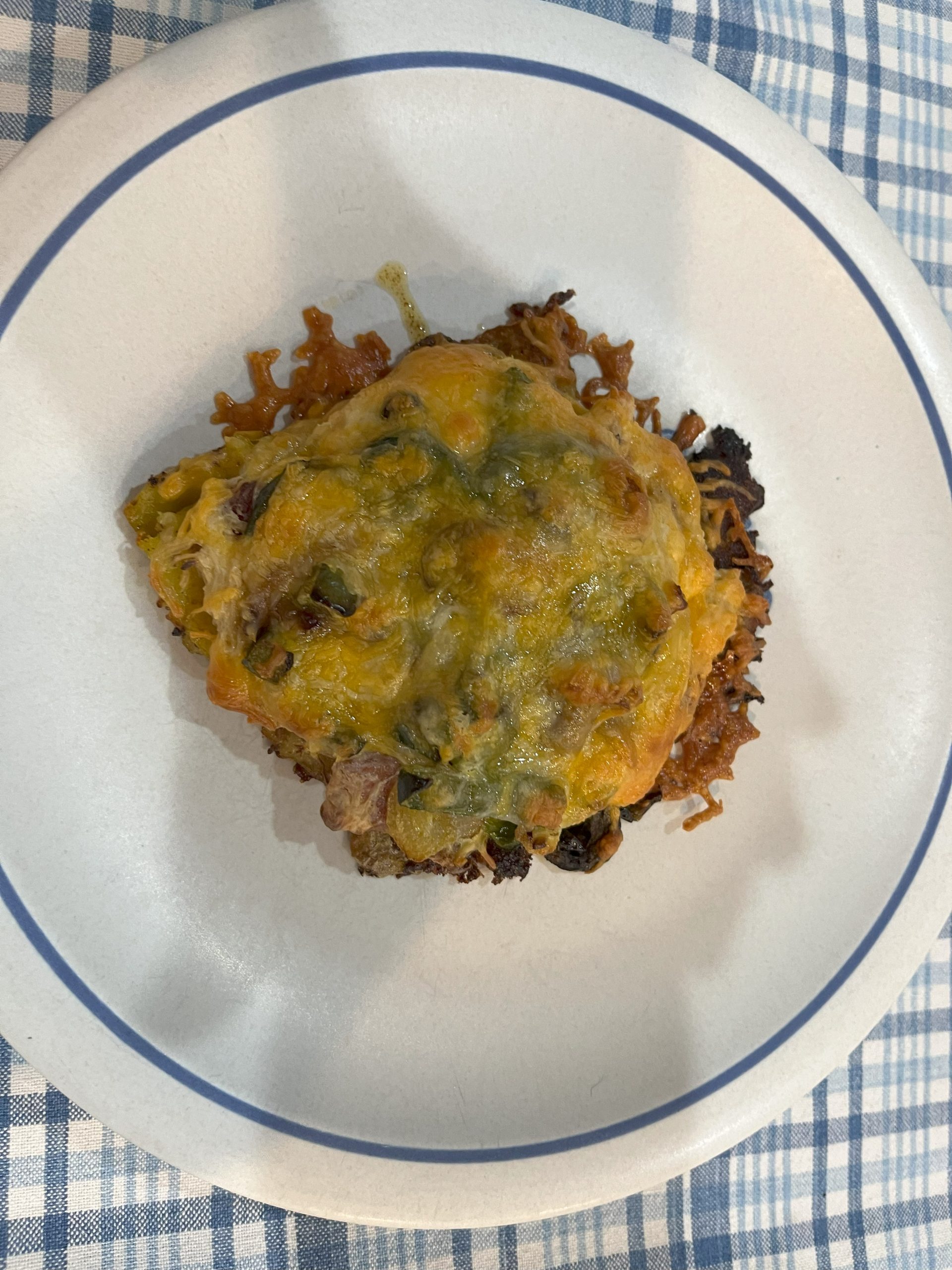 - Top with chicken mixture, pepper and onion mixture & cheese.