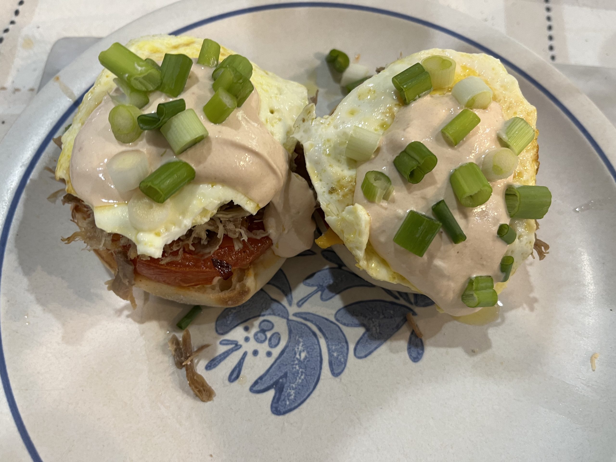 • Place the muffins on separate plates cut-side up. Top with the tomato slices, pulled pork, poached eggs, a drizzle of sauce and a sprinkle of scallions