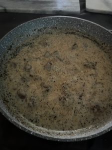 - With your finger, tear small pieces of sausage and add them in a single layer to a large heavy skillet. Brown the sausage over medium-high heat until no longer pink. Reduce the heat to medium-low. Sprinkle on half the flour and stir so that the sausage soaks it all up, then add more little by little. Stir it around and cook it for another minute or so, then pour in the milk, stirring constantly.
