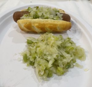 • In a large bowl combine sauerkraut, celery, onion and green pepper.