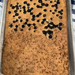 - Sprinkle the strawberries, chocolate chips and blueberries over the batter in three sections.