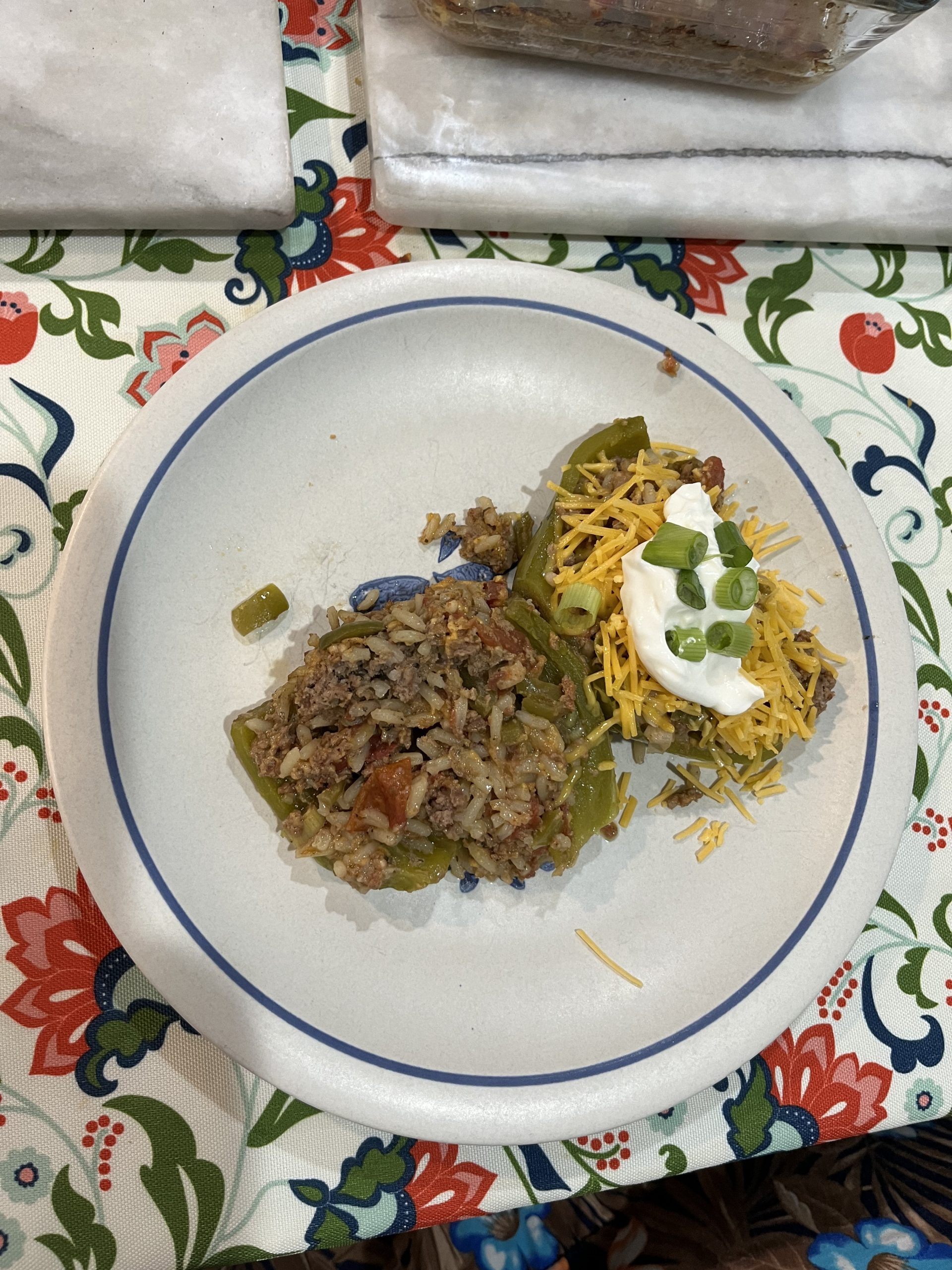 - Mix the reserved chopped pepper with the ground beef, tomatoes and their juices, 1 cup of the cheese, cooked rice, garlic, 3 of the scallions, chili powder, cumin, 1 1/2 teaspoons salt and several grinds of black pepper in a large bowl with your hands until combined. Dividing evenly, spoon the filling into the hollowed-out peppers, packing it in (the filling will mound a bit above the tops).