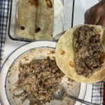 • Place 1/3 cup of beef mixture in the middle of each tortilla, roll up and place in 9 X 13 baking dish, that has been lightly coated with sour cream, seam side down. Continue to do this until your pan is full. Put remaining sour cream over the top of the tortillas in the dish, Top with cheese.