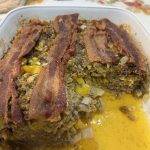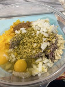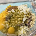 - Mix ground beef, eggs, tortilla chips, seasonings, onion, pepper and garlic together.