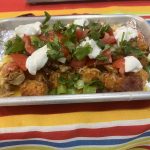 - Drizzle the top with reserved ⅓ cup warm queso and garnish with diced tomatoes, onion and jalapenos. Dollop with sour cream and serve any remaining on the side.
